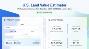 A land value estimator is an automated valuation tool that calculates the fair market value of vacant land, acreage, or residential lots using real-time data. It analyzes comparable sales, zoning classifications, location multipliers, and GIS mapping data to deliver instant property valuations—whether you’re looking at Iowa’s high-productivity cropland at $9,790/acre or Texas raw land averaging $2,970/acre with the widest price variance in the nation.